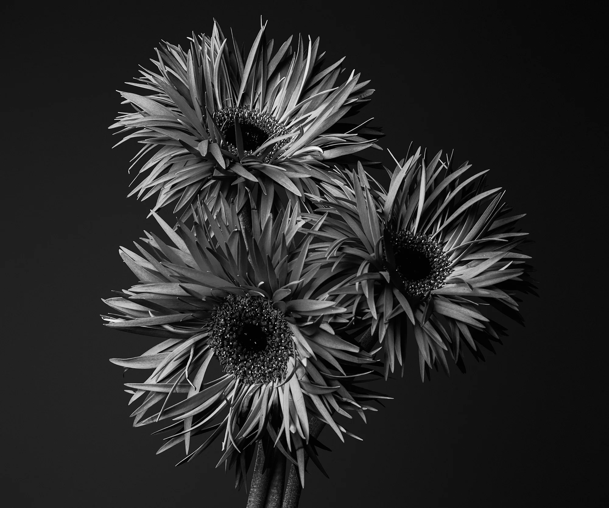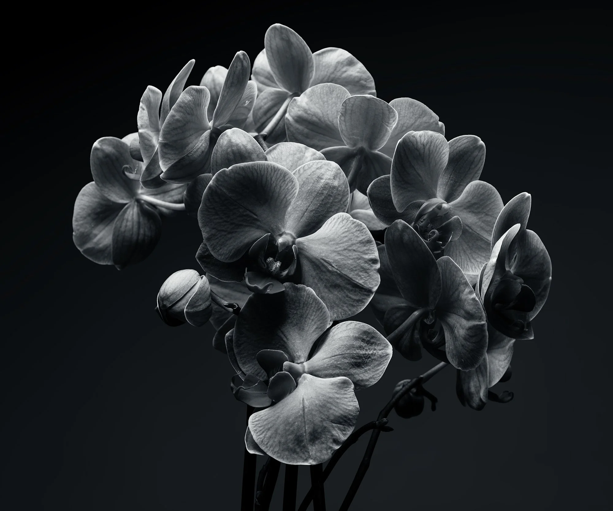 The images are made through sustained observation and careful adjustment. Flowers are photographed in isolation, under controlled light, allowing subtle shifts in orientation, tension, and surface to emerge over time. Each photograph registers a moment of alignment between form and light, where small decisions—angle, distance, restraint—shape the image more than gesture or drama.